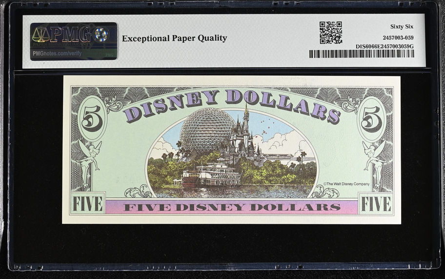 The front of this note features Goofy with closed eyes and the back features a composition of Disney attractions including the EPCOT geosphere, Cinderella’s Castle, the monorail, and the Mark Twain Riverboat. The new upper right legend now matches across the board. This is the last year Disney will use the term "used as legal tender" when describing the redemption of Disney Dollars.