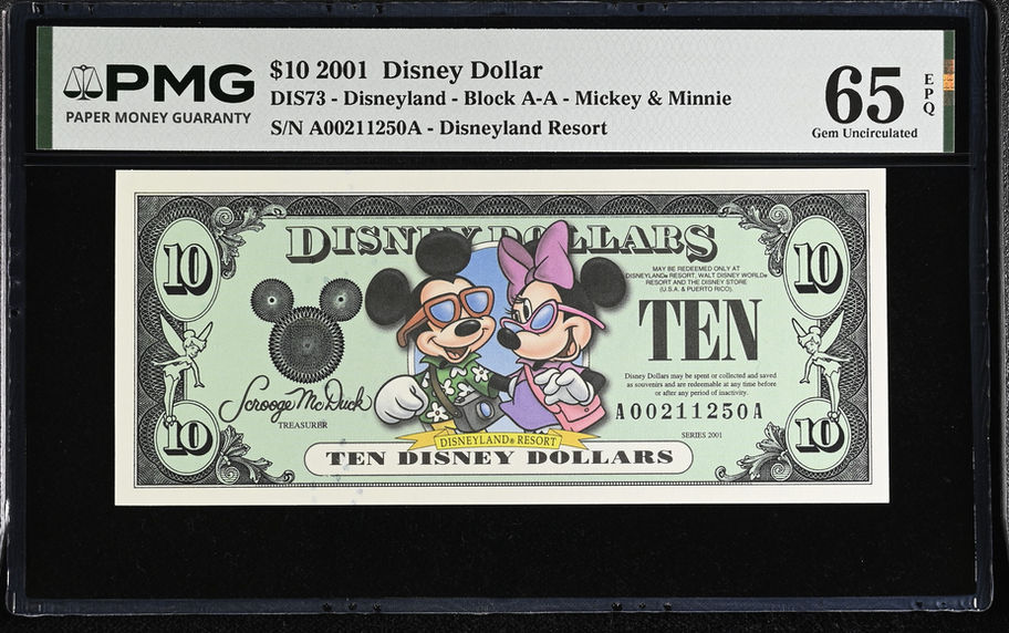 2001 Mickey & Minnie Disney Dollar $10.00 - PMG 65 Gem Unc.