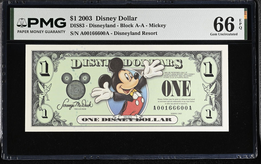 2003 "AA Series" Tuxedo Mickey $1 Disney Dollar - PMG 66 Gem Unc. EPQ