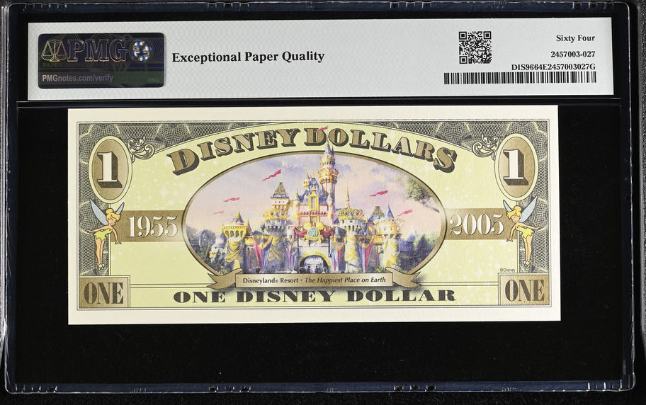 JNPDisney presents this 2005 T Series $1.00 Disney Dollar. It features Dumbo on the front celebrating Disneyland's 50th Anniversary with confetti on the front and the Disneyland Resort separating 1955 and 2005 on the back.
