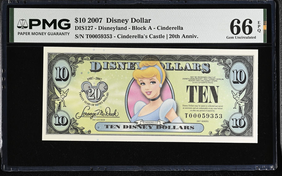 2007 Cinderella Disney Dollar $10.00 - PMG 66 Gem Uncirculated