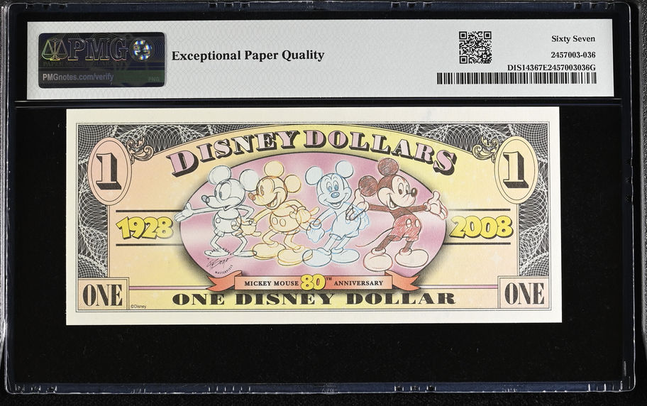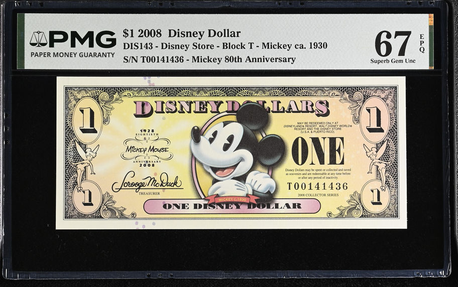 2008 "T Series" Mickey 80th Anniversary $1 Disney Dollar PMG 67