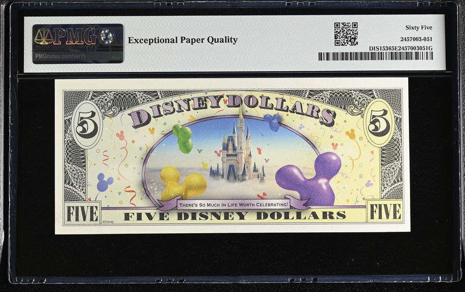 The back of each note features Cinderella's Castle protruding though the clouds surrounded by Mickey Mouse Balloons. The Ribbon reads, "There's so much in life worth celebrating!" In keeping with the year's promotion, the Disney Dollars followed the theme of "What Will You Celebrate?".