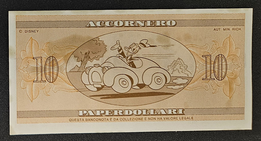 JNPDisney presents this Accornero Dollar featuring Paperino (Donald Duck) - 10 Paperdollari from 1988. These rare Banknotes were printed in Milan, Italy and distributed along with biscuit boxes by Accornero "I Frollini di Nonna Papera" (The Biscuits of Grandma Duck). These were famous biscuits (cookies) each with the faces of Disney characters. In each package you found a Paperdollari, an authentic watermarked banknote. Each month, for a one year period, Accornero would select a serial number and award the winner 1 million in gold tokens that could be used towards prizes. There were 8 notes of varying denominations and colors. The notes served as collector's items and raffle tickets. The Paperdollari were issued in 2, 5, 10, 20, 50, 100, 500 & 1,000 denominations. Aside from the predominant distribution with the Accornero biscuits. single notes were also packaged with Topolino magazines.