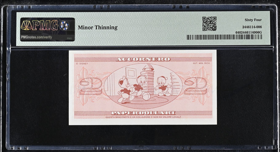 JNPDisney presents this Accornero Dollar featuring Qui, Quo and Quafrom 1988. These rare Banknotes were printed in Milan, Italy and distributed along with biscuit boxes by Accornero "I Frollini di Nonna Papera" (The Biscuits of Grandma Duck). These were famous biscuits (cookies) each with the faces of Disney characters. In each package you found a Paperdollari, an authentic watermarked banknote. Each month, for a one year period, Accornero would select a serial number and award the winner 1 million in gold tokens that could be used towards prizes. There were 8 notes of varying denominations and colors. The notes served as collector's items and raffle tickets. The Paperdollari were issued in 2, 5, 10, 20, 50, 100, 500 & 1,000 denominations. Aside from the predominant distribution with the Accornero biscuits. single notes were also packaged with Topolino magazines.