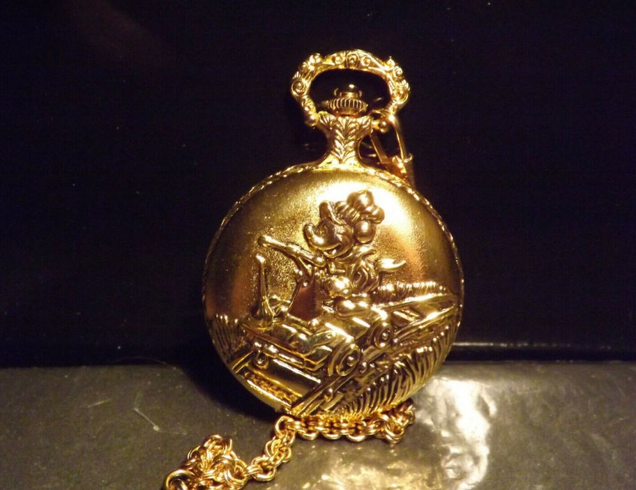 Brand New!!!! Hard to Find Collectible Disney Train Engineer Mickey Mouse Pocket Watch. Black-tone Numerals for the Hour Markers with Gold-tone Chain and fob Included. (Rare and Retired) Gold-tone Pocket Watch with a Colorful Train Engineer Mickey Mouse and Black-tone Mickey Hands for the Hour and Minutes with a Black-tone Second hand. Pocket Watch Bezel is 51mm in Diameter. Vintage Mickey Mouse Watch by Disney. This item is new in the original box.