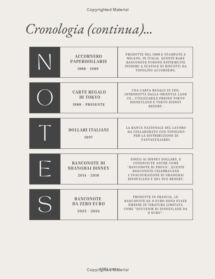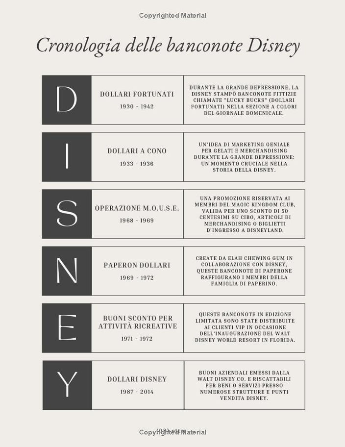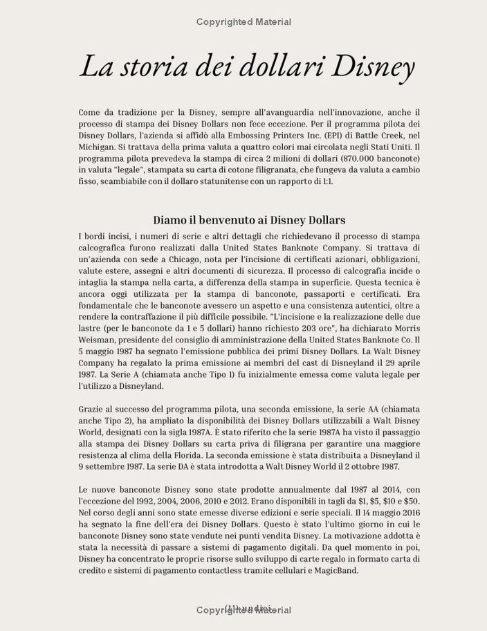 In questa edizione sono inclusi: Listino prezzi aggiornato al 2025, elenchi e codici PMG/PCGS, immagini di tutti i Disney Dollar, Disney Lucky Bucks, Cone Dollars, buoni sconto, banconote Operation M.O.U.S.E., banconote Fantastiliardi (Dollari italiani), Elah Scrooge Dollar$, carte regalo di Tokyo (Yen) e molto altro... È inclusa anche una checklist personale per tenere traccia della vostra collezione.