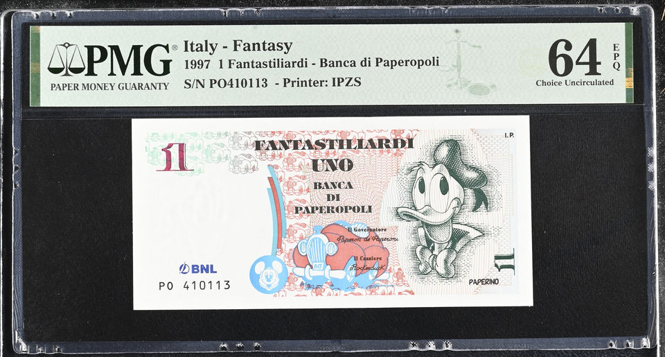 In 1997, created in Italy, these dollars were issued in 1, 10, 50, 100, 500, and 1000 Fantastiliardi (Bazillion). These notes featured the members of the Donald Duck family and are from the imaginary Banca di Paperopoli (Bank of Duckburg). These are fantasy dollars easily confused with Disney Dollars. That doesn't take away from their rarity or collectibility for an avid Disney Collector.