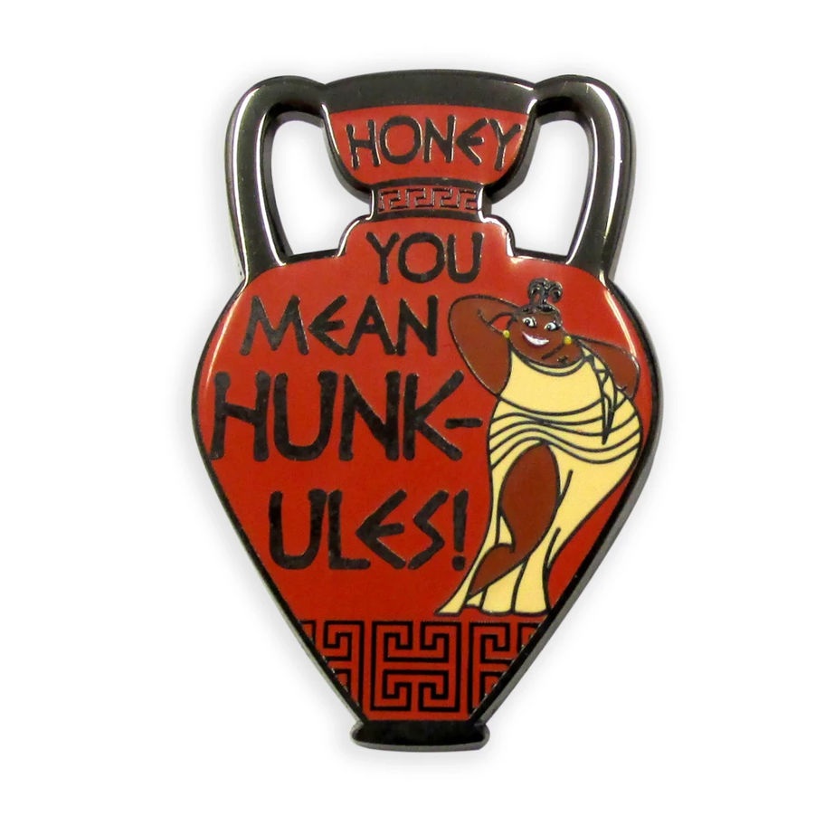 On this unique ancient jar-shaped pin, Thalia–the Olympian Muse of Comedy, exclaims ''Honey, you mean Hunk-ules!'' in reference to the ripped demigod.
